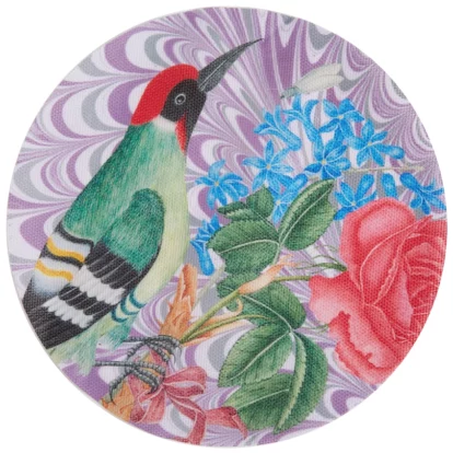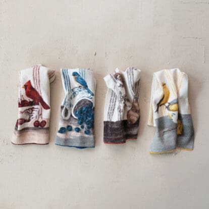 Cotton Waffle Weave Tea Towel with Bird on Dish & Pom Pom Trim, 4 Styles