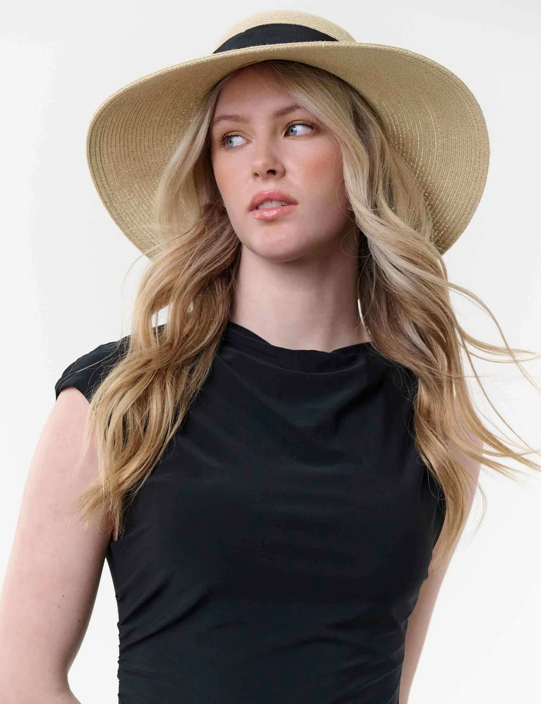 Elegant ladies’ hat for sunny days (36 x 10 cm). Ultra lightweight and breathable, with a wide brim for optimum sun protection. The sewn-in, elastic lining band fits perfectly, also ideal for larger head sizes from 56 cm. Wide grosgrain ribbon knotted at the back – perfect with a dress, by the pool or when strolling around town on vacation.