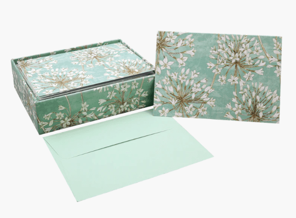 Elegant note cards feature a display of delicate white Allium Blossoms in full bloom, artfully arranged against a softly textured background.