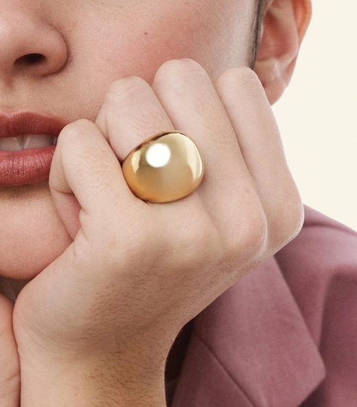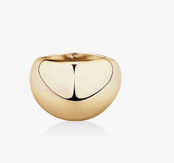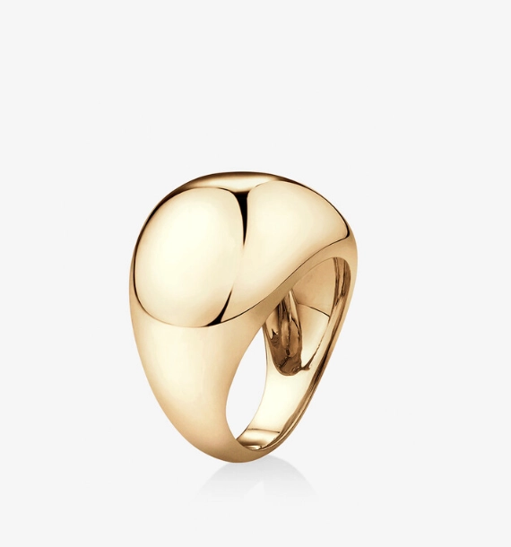 A tapered comfortable band with a large ball dome top. It is hollowed out but still weighty.