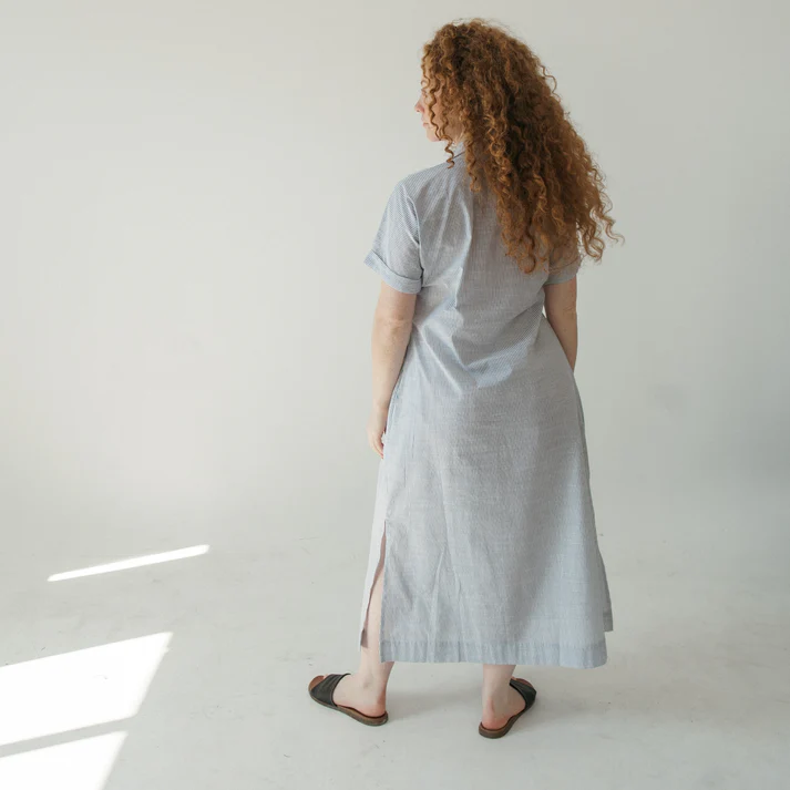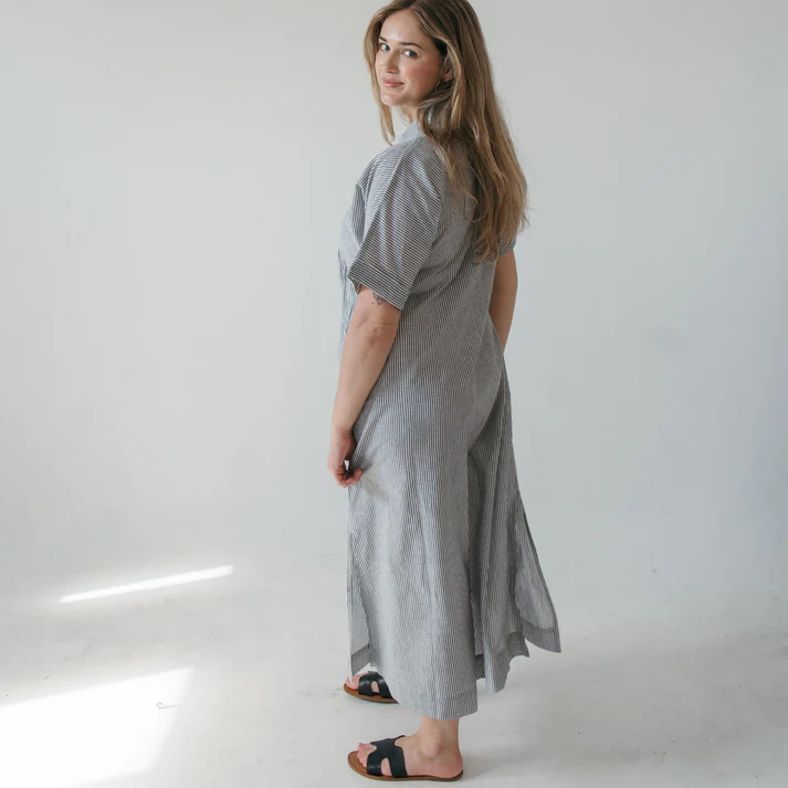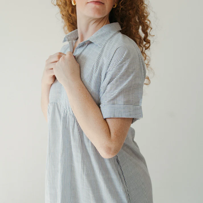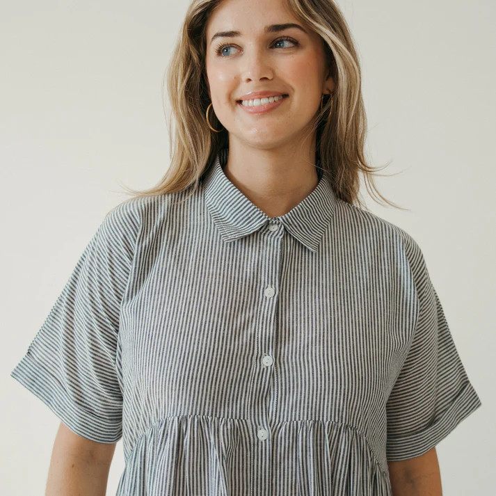 Featuring a classic a-line cut that offers a flattering, relaxed fit without feeling oversized. with a crisp, pointed collar that adds an instant “put-together” vibe, whether you’re in a boardroom or at brunch. Full-length button-down front with tonal buttons, short sleeve, and deep, functional side-seam pockets.