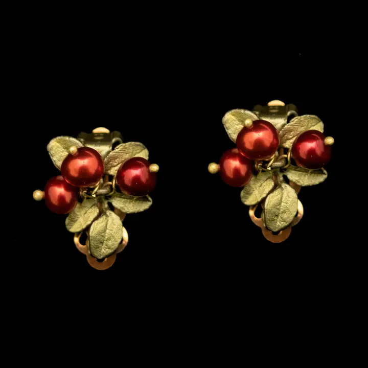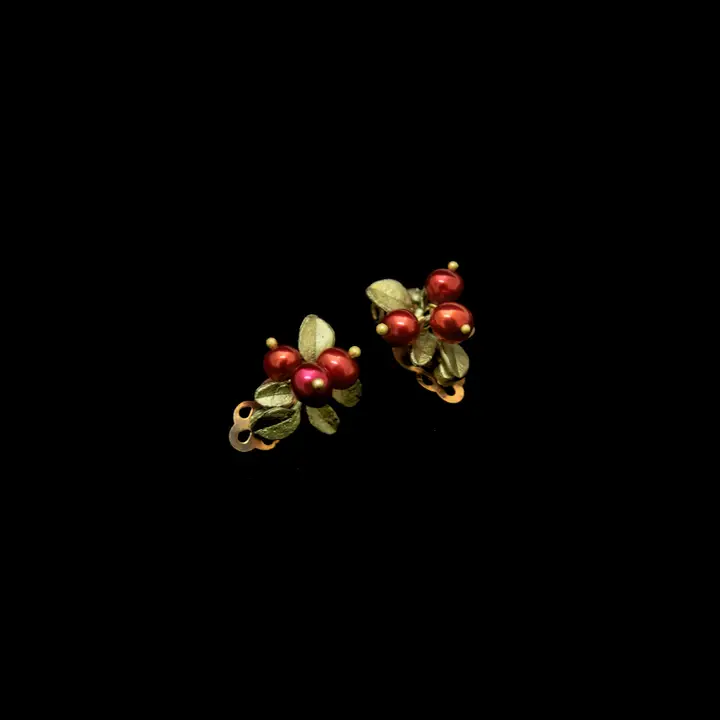 The cranberry earrings are cast in hand patinated bronze and accented with cranberry freshwater pearls.