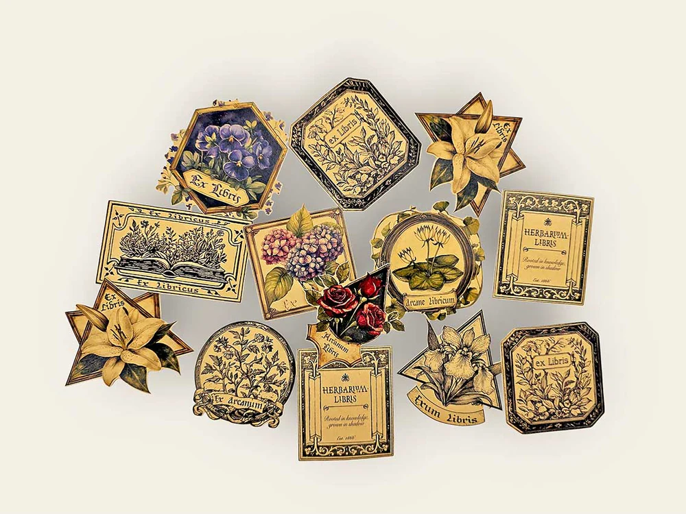 Add a touch of academia to your craft projects with this Ex Libris Sticker Pack! Featuring 20 charming pre-cut stickers inspired by classic vintage bookplates and botanical studies. An ex libris, also known as a bookplate, is a printed or decorative label pasted into a book, often on the front endpaper, to indicate ownership.