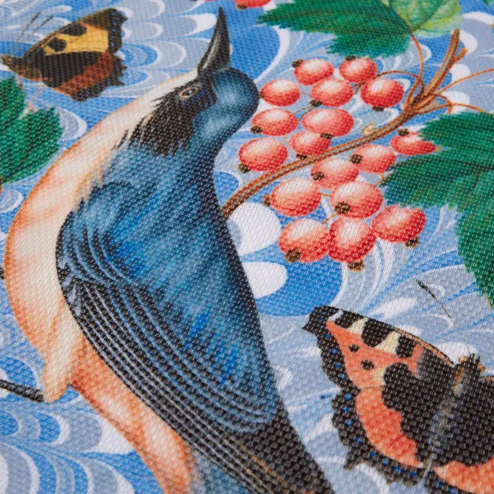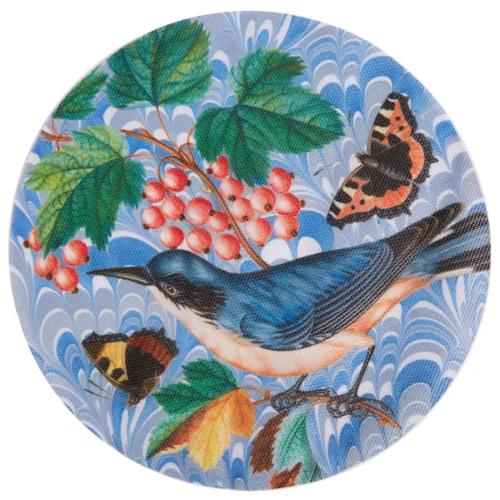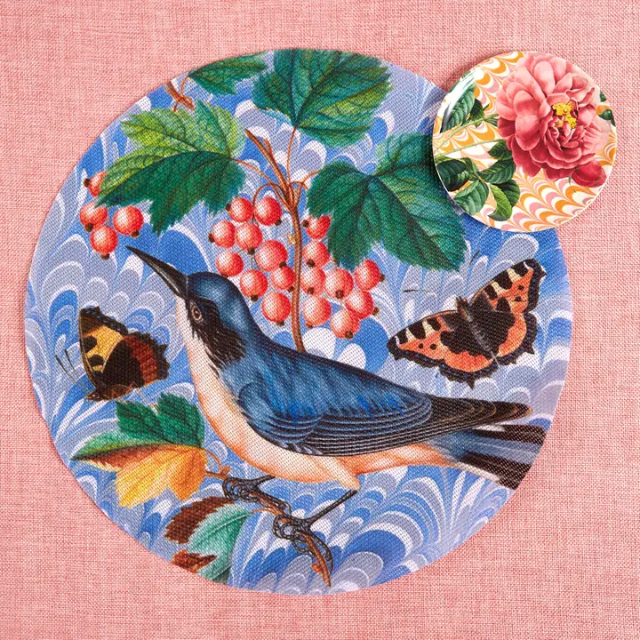 Made from an easy to care for woven vinyl, these placemats are fun, elegant, and will add just the right pop of pattern and color to your next dinner party. Just wipe clean and they are ready to go. Printed with a Flora and Fauna pattern featuring antique botanical illustrations of birds, flowers, and insects juxtaposed with vintage marbled paper patterns. Perfect to use indoors or out!