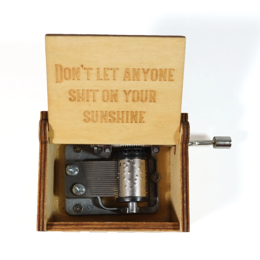 A bright, pocket-sized keepsake with attitude—this hand-crank music box features a yellow wooden, laser-etched outer design and plays “You Are My Sunshine” when cranked. A playful, uplifting gift with an edge—perfect for cheering someone up or keeping on your desk.