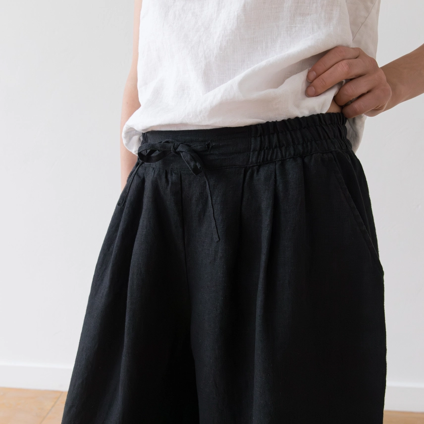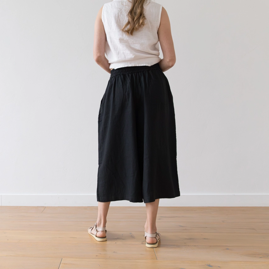 Step into a new season with perfectly styled wide leg cut linen culottes. They feature an elasticated waistband accompanied by a drawstring in front, two side pockets and calf length. Style them with a sleeveless linen tank for a hot day or add a jacket for a cooler morning or evening.
