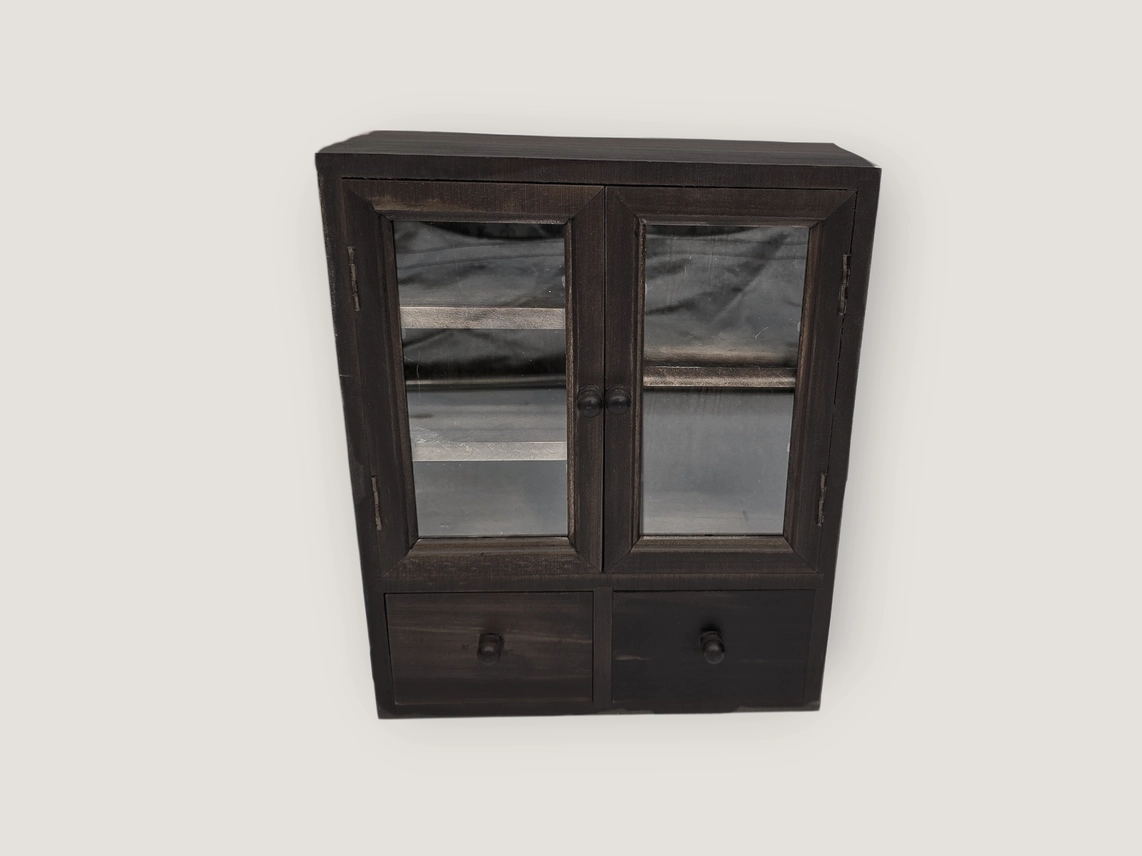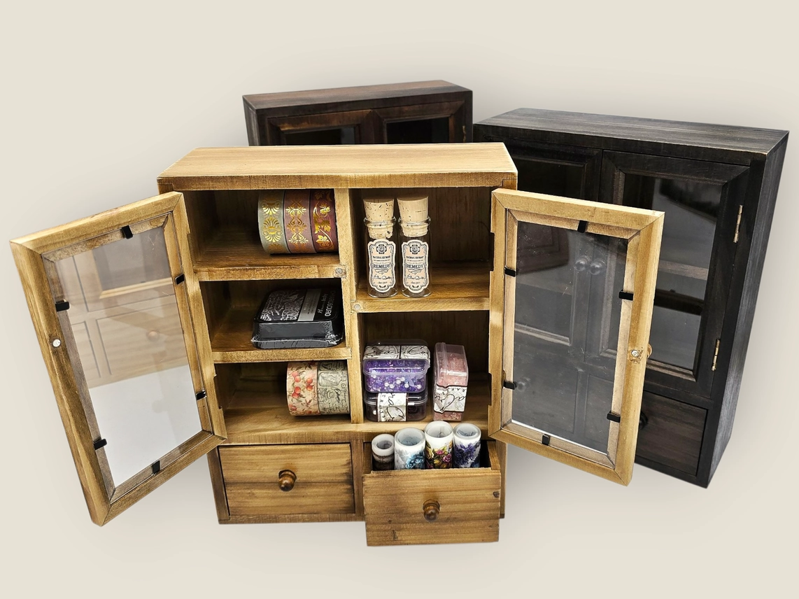These wooden cabinets will add a beautiful decorative touch to your desk or creative space. They are also highly functional, with two drawers, and shelves of different heights. This product is handmade