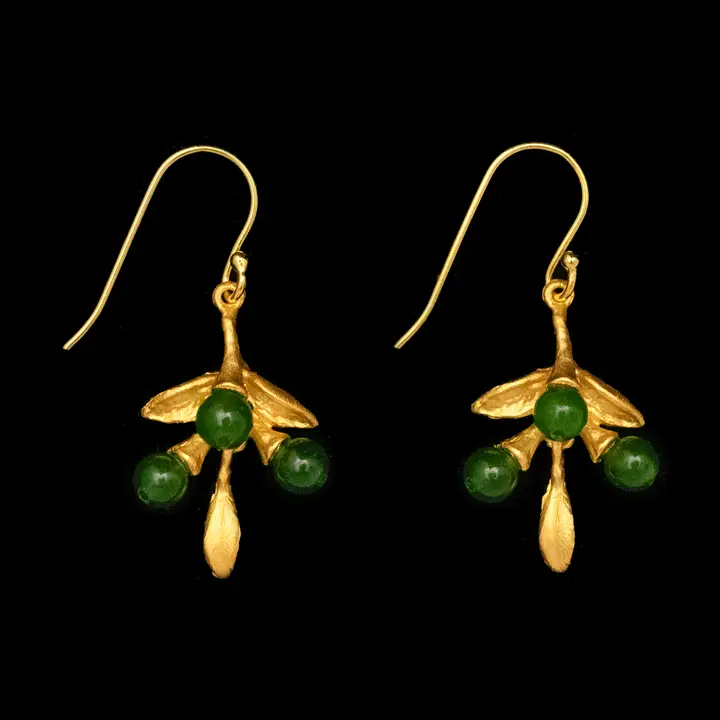 cast in 24k gold plated bronze and accented with green jade beads. the wires are 925 silver with 24k gold plating.