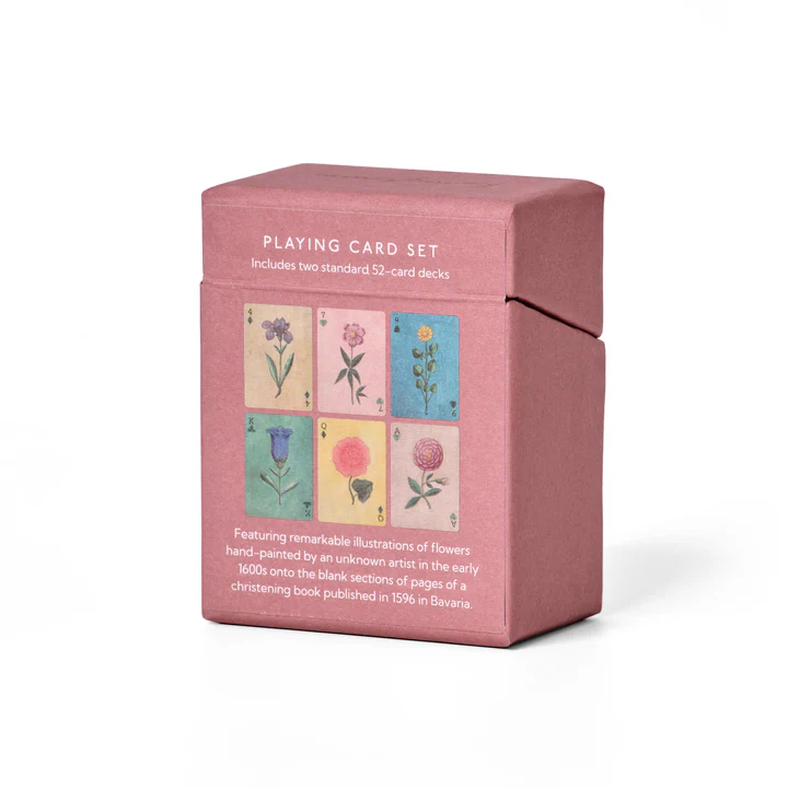 This Set of Two 52-Deck Playing Cards features remarkable watercolour illustrations of flowers, hand-painted by an unknown artist in the early 1600s, onto the pages of a 1596 book dedicated to the Christening of Lady Elisabeth of Hesse. The artwork has carefully been adapted and enhanced and applied to each of the playing cards in this Set of Two 52-Deck Playing Cards that come stored in a premium quality flip-top card hinged box.