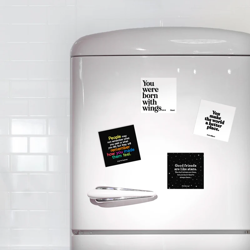 Spread the words with quotable magnets. Always meaningful, each magnet is perfect to give, keep, or display on your fridge, car, or any magnetic surface.