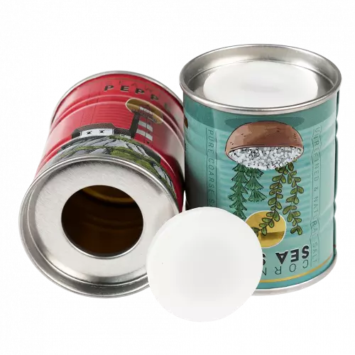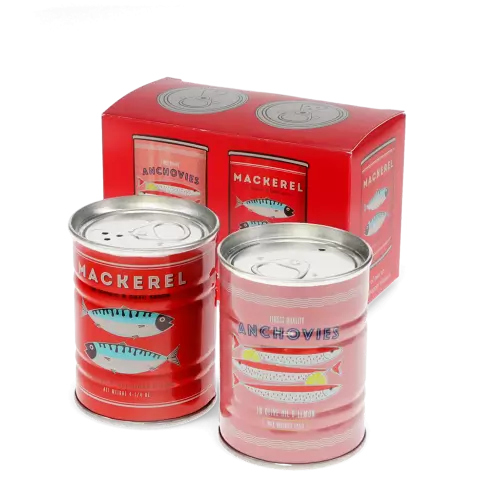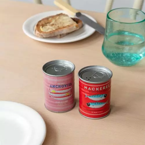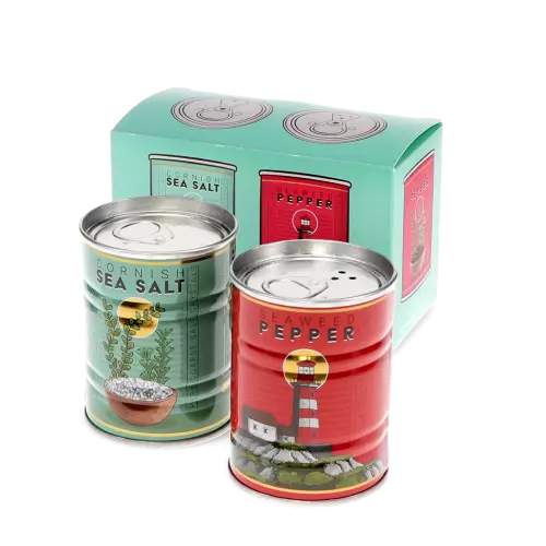 Season in style with this pair of salt and pepper shakers! The perfect addition to any kitchen or dining table, these metal salt and pepper shakers feature a vintage-inspired Fish packaging design OR retro style Cornish sea salt and Seaweed pepper branding, with a lighthouse and seaweeds.