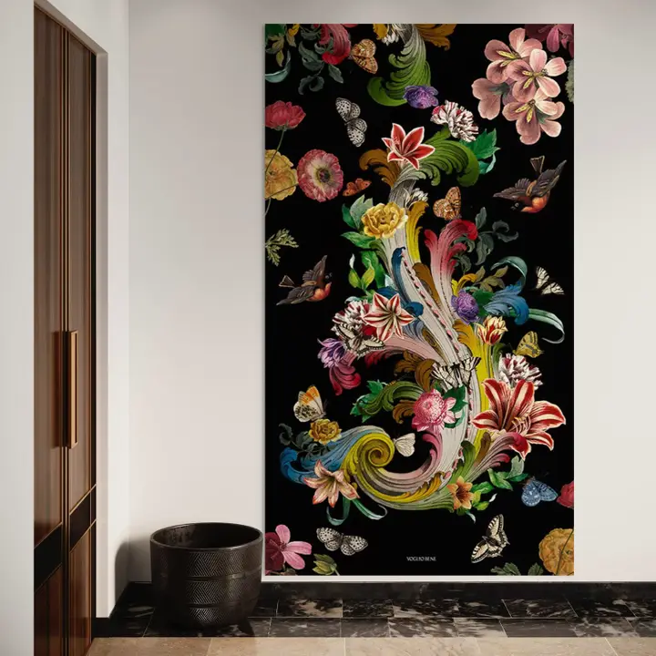 Indoor hanging format 137x247cm. Printed on polyester velvet. High definition printing. Comes with a rod hem at the top and a simple hem at the bottom.